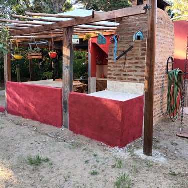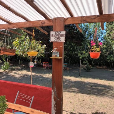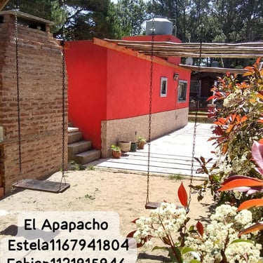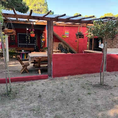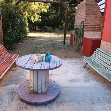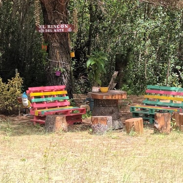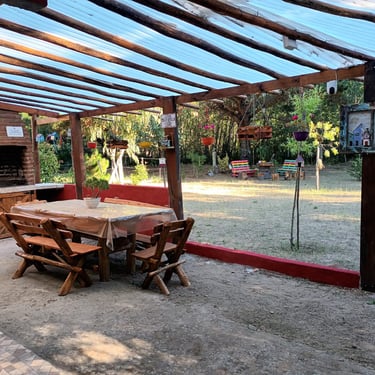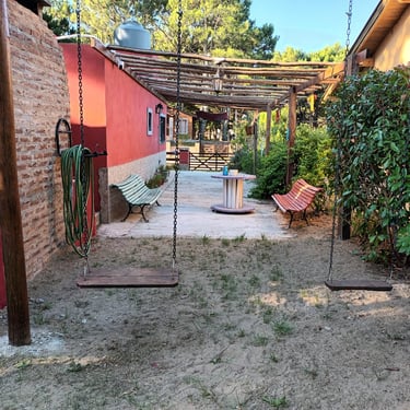 Amplio parque con mesa y bancos de tronco debajo de uno de los pinos, hamacas para niños.